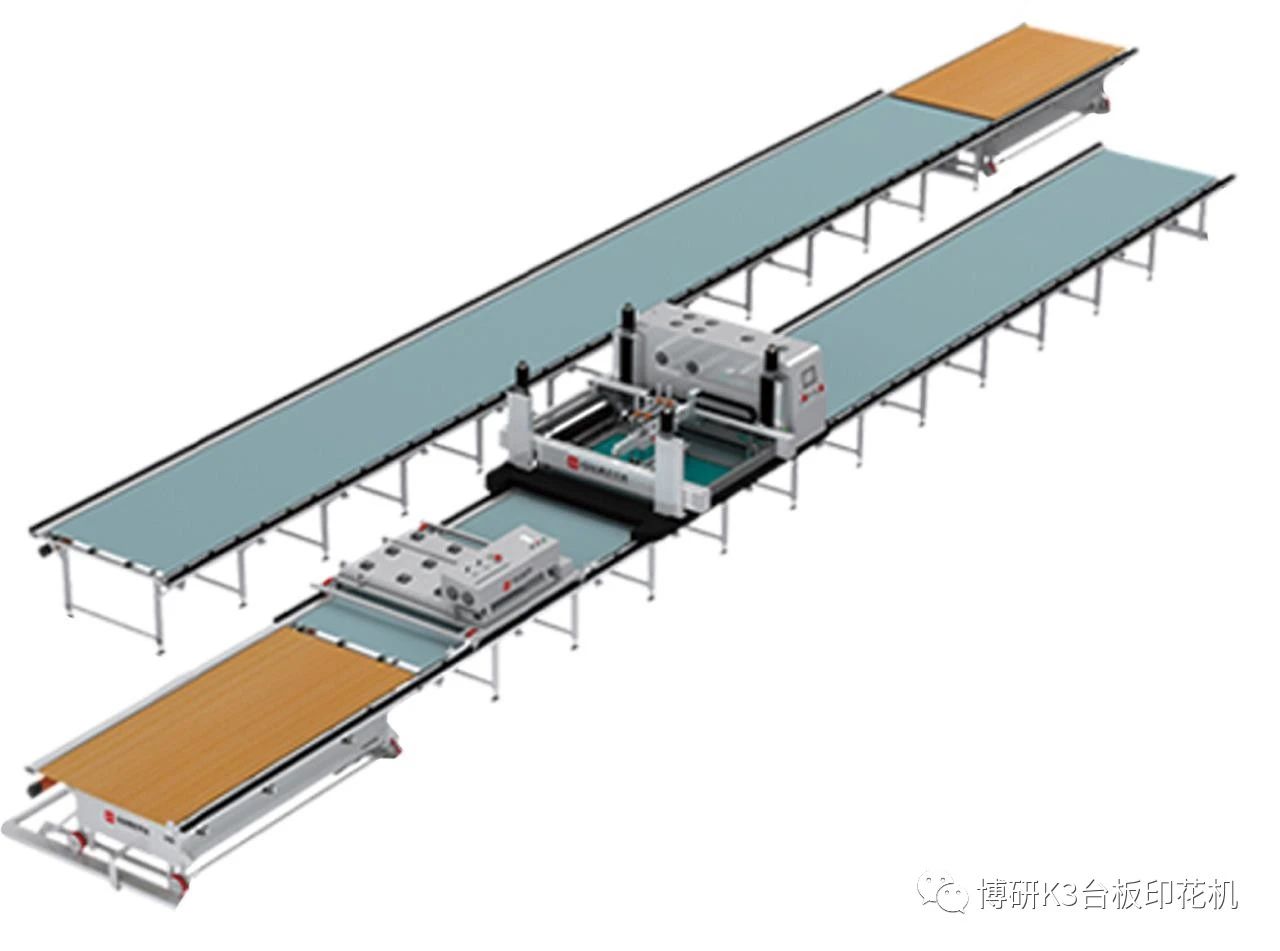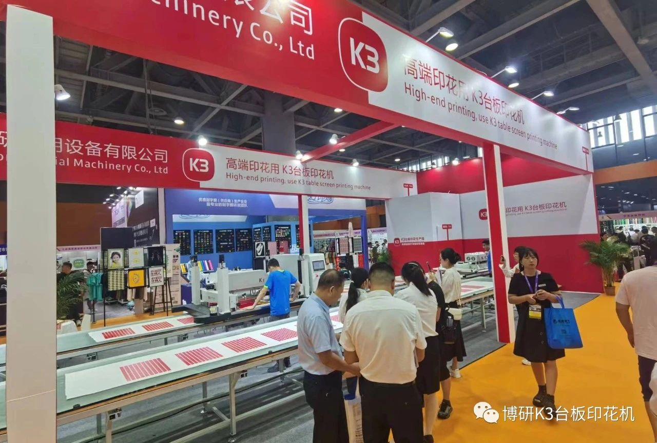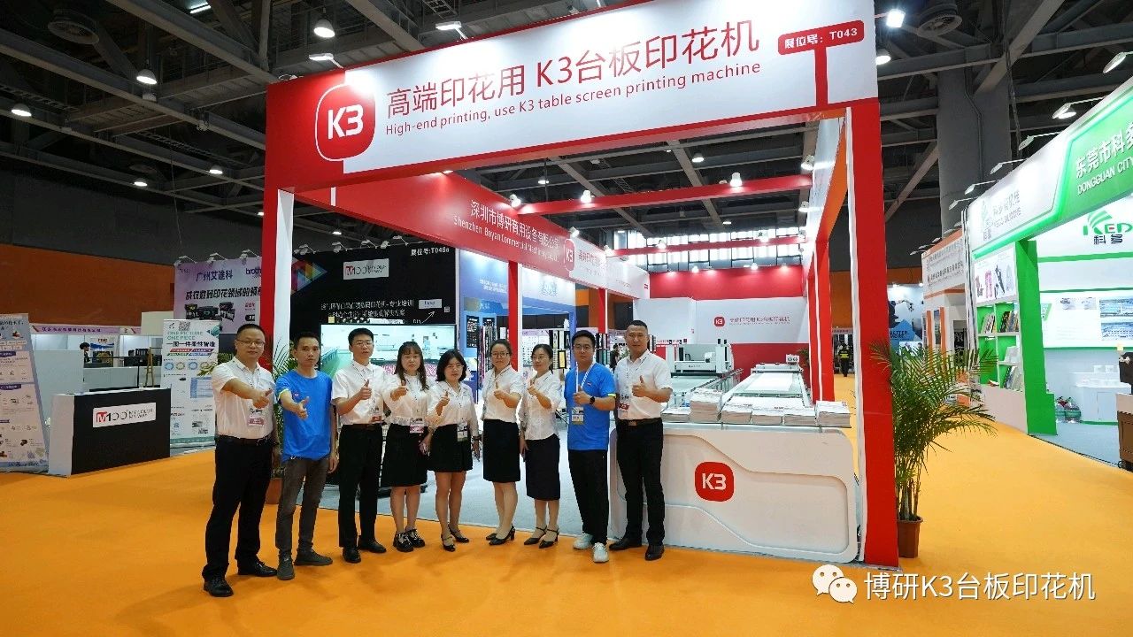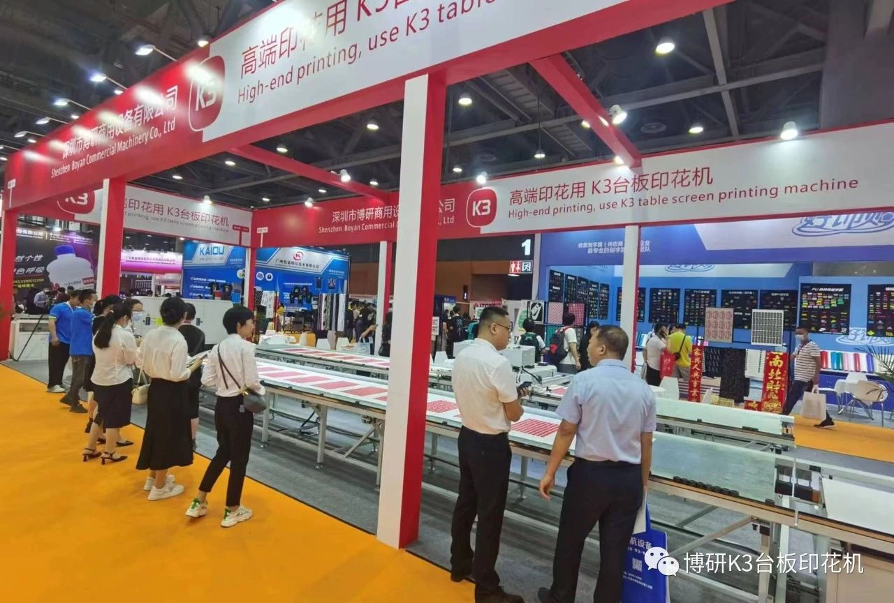 本次博研参展产品为全伺服K3台板印花生产线全线产品,包括一台K3台板印花机、一台行走式烘干机、两条9米长精密机用台板、两端自动周转平台,以及精美的K3印品。