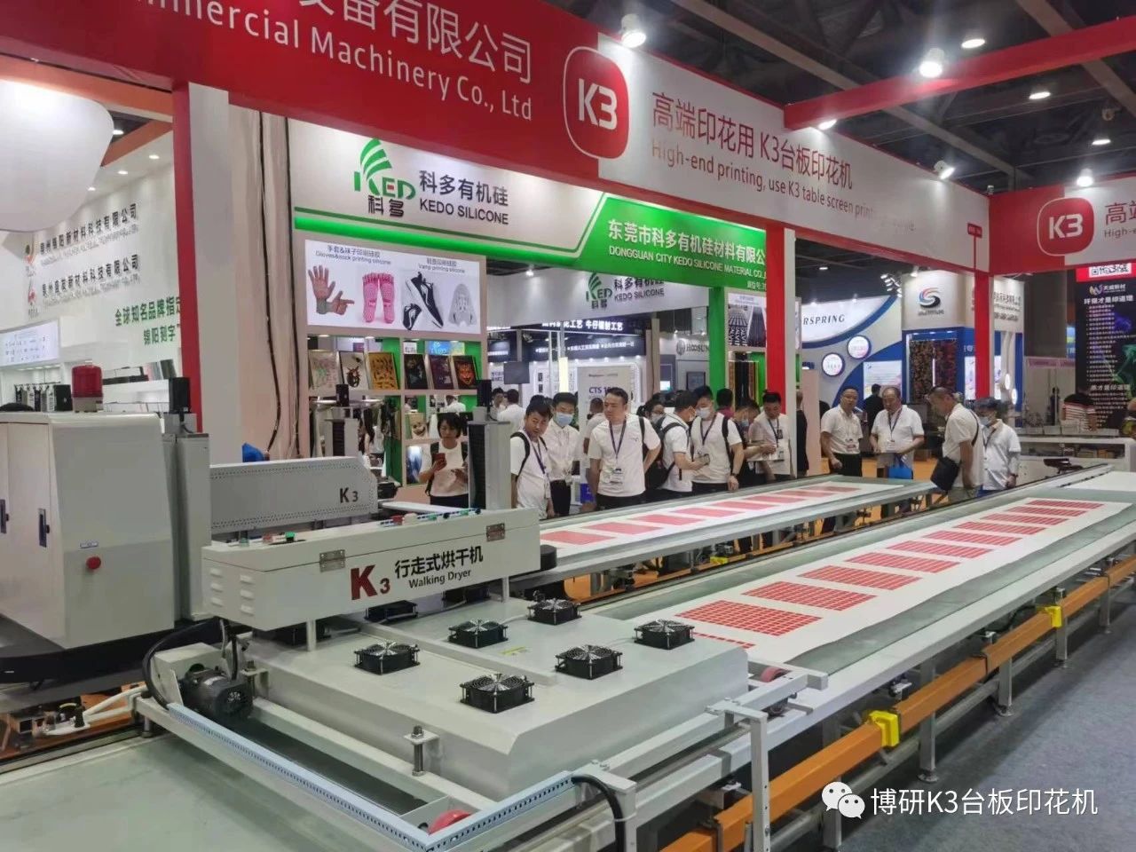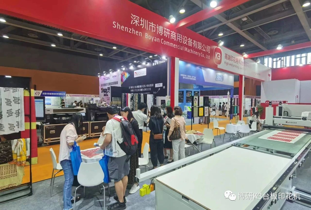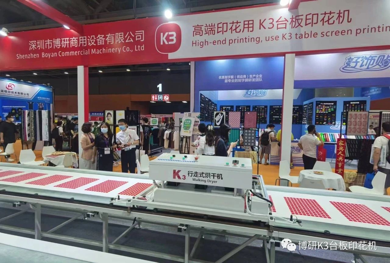本次博研参展产品为全伺服K3台板印花生产线全线产品,包括一台K3台板印花机、一台行走式烘干机、两条9米长精密机用台板、两端自动周转平台,以及精美的K3印品。