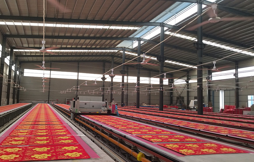河南某喜庆用品印花工厂,主要生产门联、发泡对联、闪粉亮片对联、植绒对联及灯笼等节庆用品。通过多遍、多层丝网印刷工艺,实现厚膜立体效果与高一致性输出,满足节庆产品对视觉效果和工艺稳定性的高要求,广泛应用于春节等高峰生产场景。